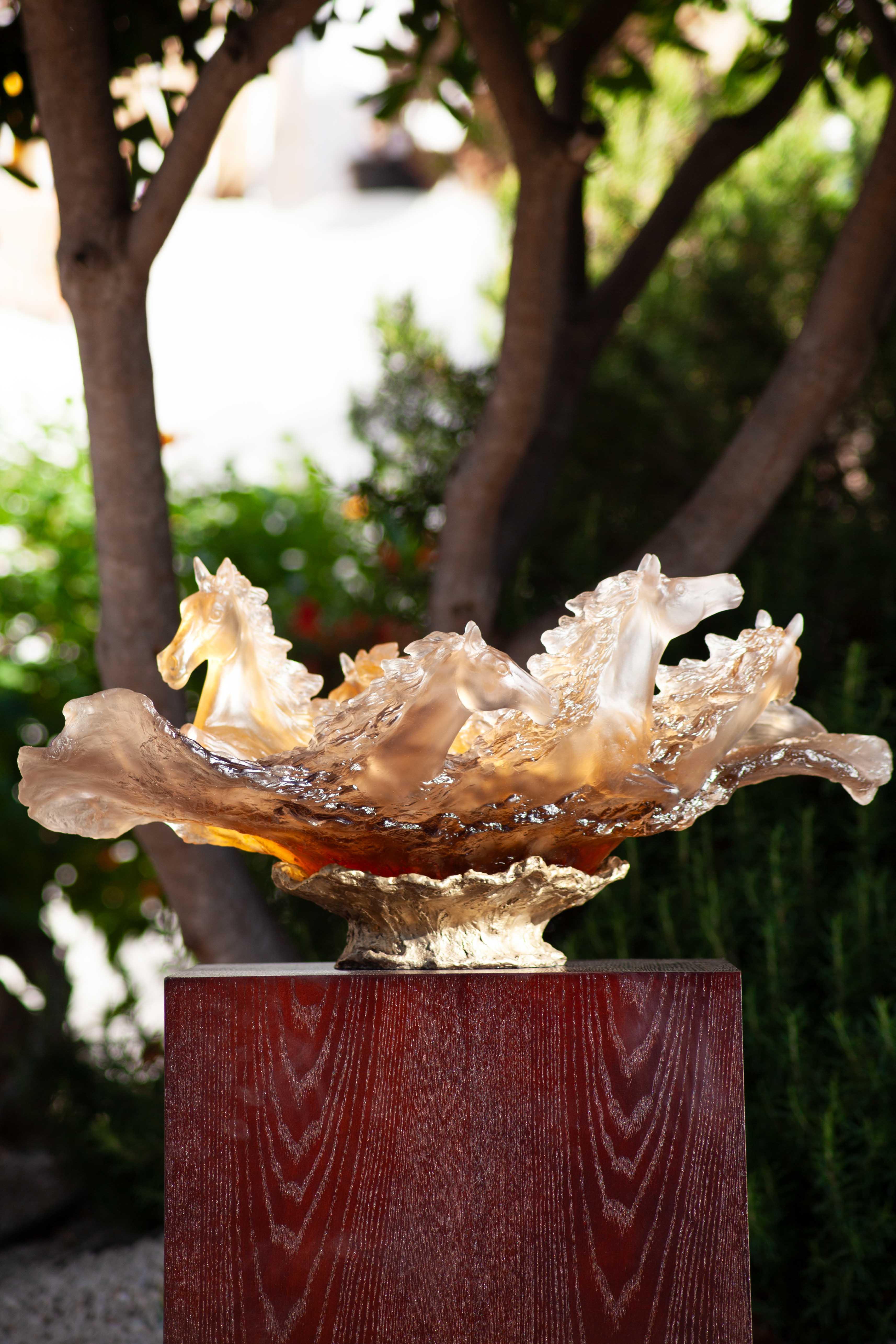 The Prestige Centerpiece, limited to just 125 pieces worldwide, is crafted in Daum crystal with graceful ice-brown, grey, and powder-pink tones. Its patinated bronze base accentuates the sculptural form, giving it both a majestic and modern allure. Through this exquisite ensemble, Daum continues to push the boundaries of crystal craftsmanship, merging artistic expression with timeless elegance.