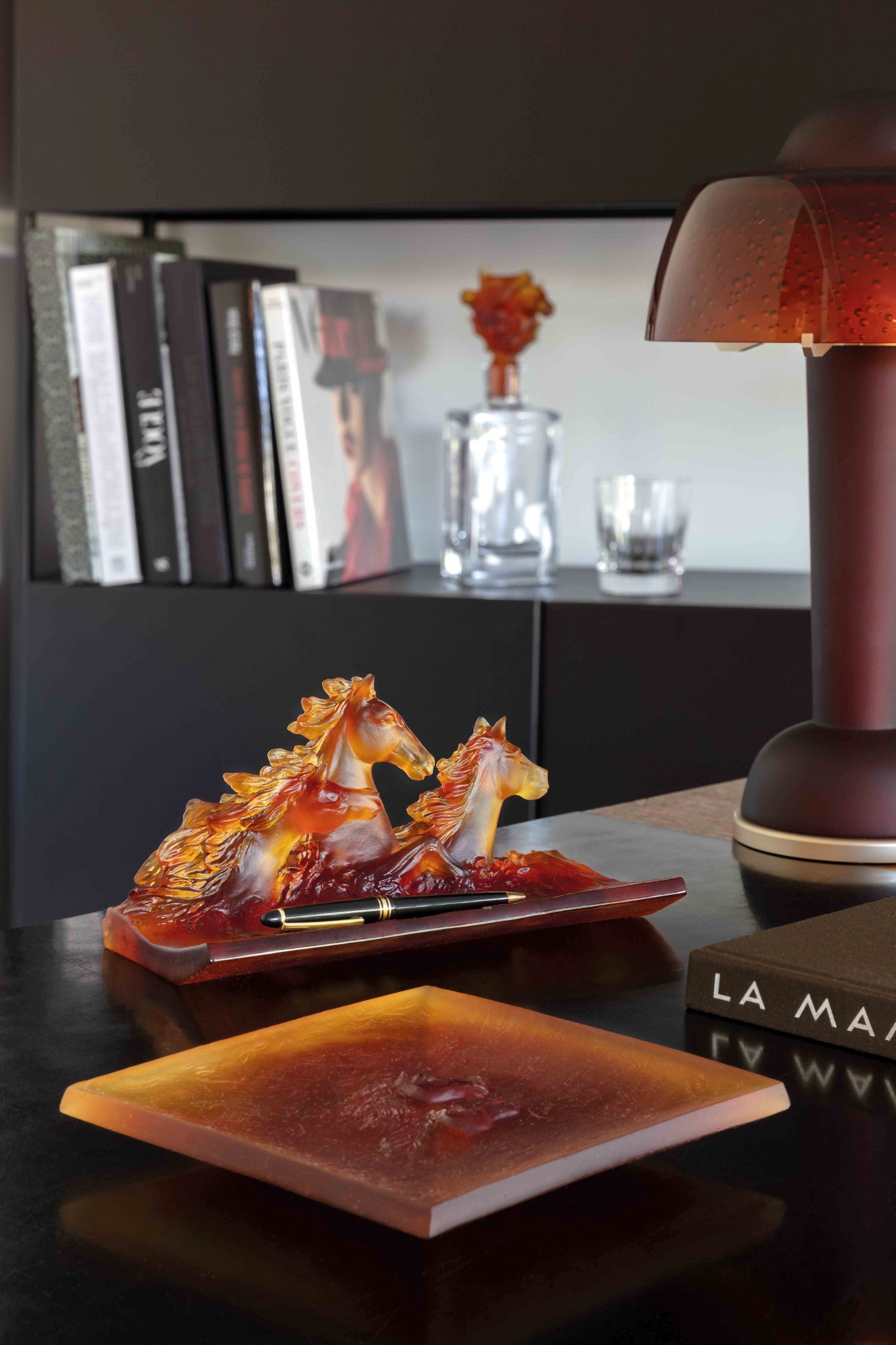 The Maison Daum reveals its exceptional savoir-faire passed down through generations with the launch of the Cavalcade collection. The horses have been delicately sculpted??to elaborate their beautifully structured head and their determined stare. The amber tones reveal the fiery and energetic spirit of the handsome creatures.