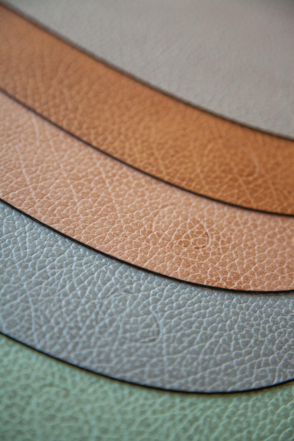 LIND-DNA大部分產品採用得到OEKO-TEX®️認證的回收皮革。這些皮革主要來自傢俱和時裝工業的剩餘物料,首先將樹膏皮(或稱為植鞣革)的核心皮革磨成粒裝,然後與從樹木提取的天然橡膠一起壓制,結果成為一種由80%皮革和20%天然橡膠組成的再做皮革物料, 最後皮革以水性顏料染色和裁剪,成為耐用、防水且易於清潔的產品。