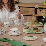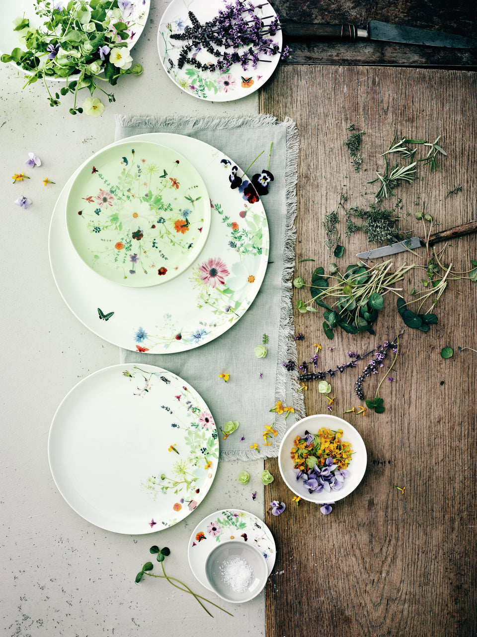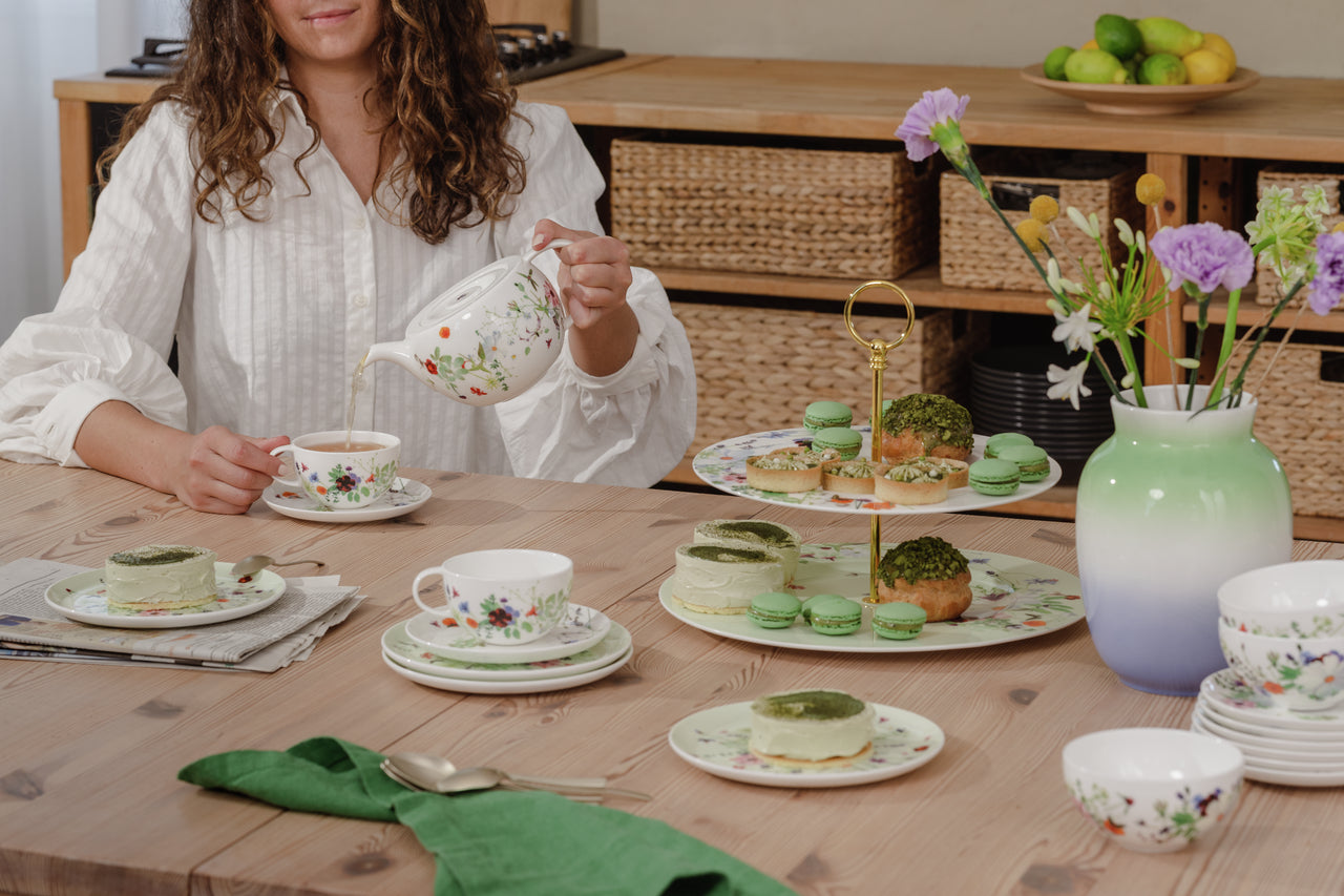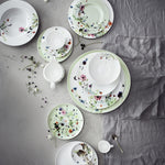 瑞士紡織設計師Regula Stüdli的»Grand Air«花卉設計骨瓷餐具系列輕盈清新。宛如在微風中搖曳,自然元素融合成絢麗的花朵組合,香料草藥和可食用的花朵編成小束,或隨意散落,甚或排列成環狀裝飾,自由漂浮於»Brillance«形態之上。2024年推出禮盒裝,包括二人茶杯和壺,以及四款馬克杯套裝。